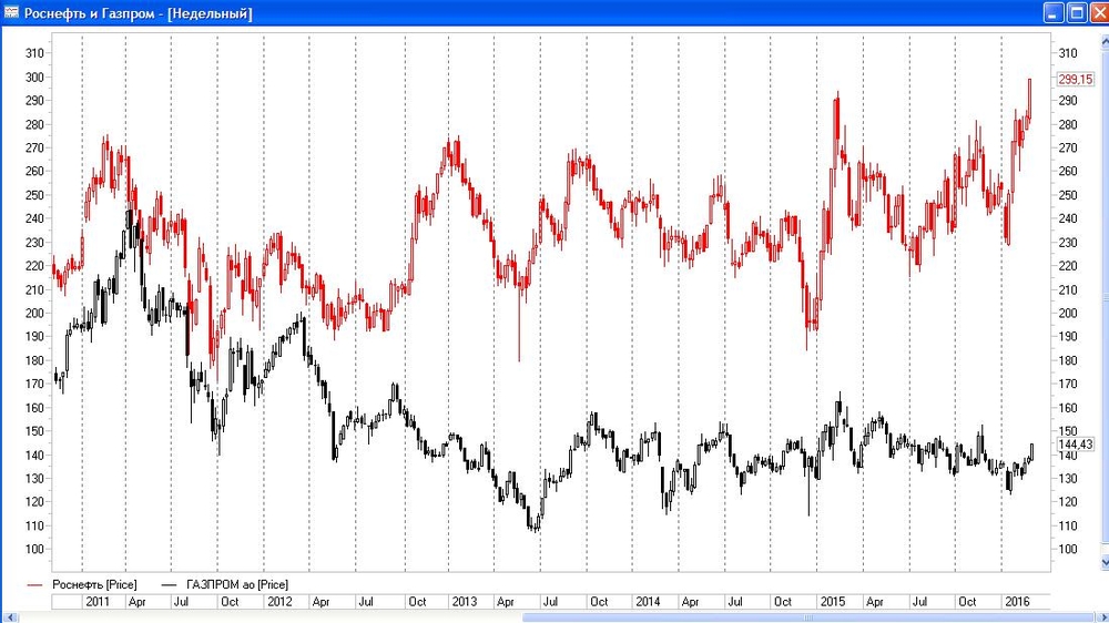 Так, например, две самых известных и ликвидных бумаги - «Роснефть» и «Газпром» ведут себя по разному. Первая вышла на новые исторические рекорды. Сегодня котировки «Роснефти» уже поднимались до отметки 299,50 рублей, что выше пиков прошлого года и максимума 2008 года.