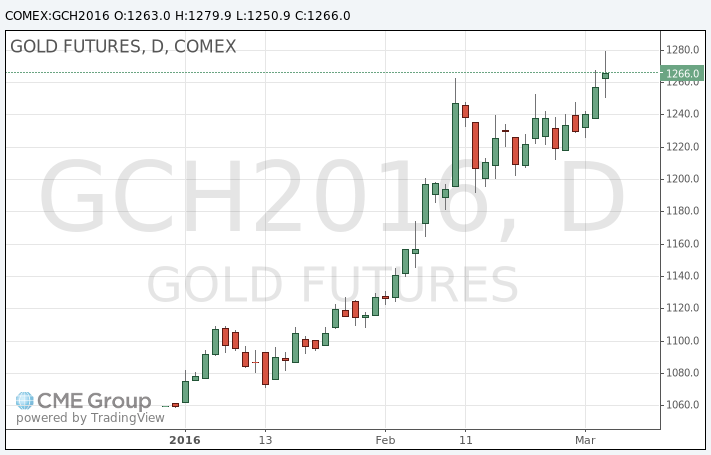 Стоимость мартовского фьючерса на золото на COMEX сегодня выросла до $1279,90 за унцию.