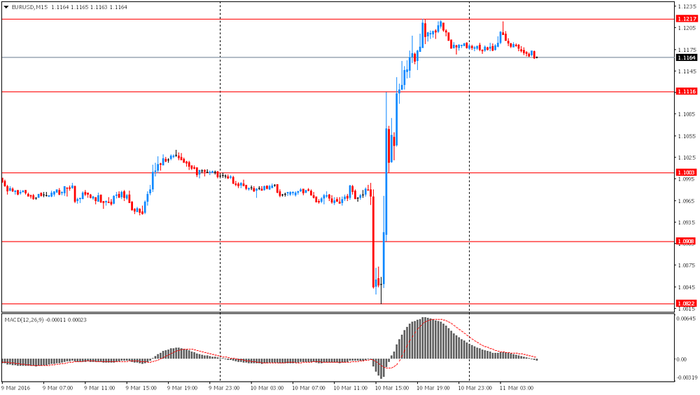 Евро торговался в диапазоне после вчерашнего бурного роста вызванного неоднозначной реакцией рынка на решения ЕЦБ о введение дополнительных мерах смягчения денежно-кредитной политики. Первоначально ЕЦБ сообщил: (1) с 16 марта 2016 года процентная ставка по основным операциям рефинансирования будет уменьшена на 5 базисных пунктов, до 0.00%; (2) процентная ставка по маржинальному кредитованию с 16 марта 2016 года будет уменьшена на 5 базисных пунктов, до 0,25%; (3) процентная ставка по депозитам с 16 марта 2016 года будет снижена на 10 базисных пунктов, до -0.40%; (4) начиная с апреля, ежемесячные покупки в рамках программы покупки активов будут расширены до 80 млрд. евро в месяц с 60 млрд. евро в месяц; (5) в список покупаемых активов включены корпоративные облигации небанковских корпораций инвестиционного класса; (6) начиная с июня, будет запущена новая серия из четырех целевых долгосрочных операций по рефинансирования, каждая со сроком на четыре года. В целом, участники рынка расценили заявления как намек, что ЕЦБ имеет ограниченное число инструментов для регулирования денежно-кредитной политики.