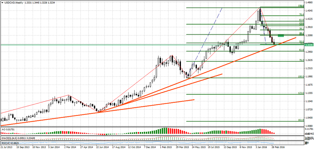 В районе уровня 1,3220 - 1,33 на недельном таймфрейме пара находится у мощнейшей поддержки. Здесь проходит рубеж коррекции Фибо 50% от всего импульса подъёма с мая 2015 г. Здесь же - трендовая линия аптренда, а также горизонтальный уровень,от которого пошёл последний импульс, обновивший верха на Д1. Поэтому можно предположить, что от данной зоны около 1,32-1,3220 может произойти отскок в коррекцию после масштабного снижения. Однако если верить голландскому анализу, на графике сформировалась и реализуется разворотная фигура «голова и плечи», и она по классике способна отработаться на уровни 1,29-1,30. Реализация такого сценария возможна при уходе цены на нефть выше 40 дол/баррель, или при очень мягкой риторике ФРС на мартовском заседании. Вероятность этих факторов оцениваем ниже, чем возможность разворота от зоны 1,32-1,3220.