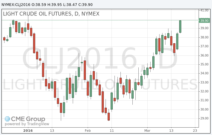 Стоимость апрельских фьючерсов на американскую легкую нефть марки WTI (Light Sweet Crude Oil) выросла до 39,95 доллара за баррель.