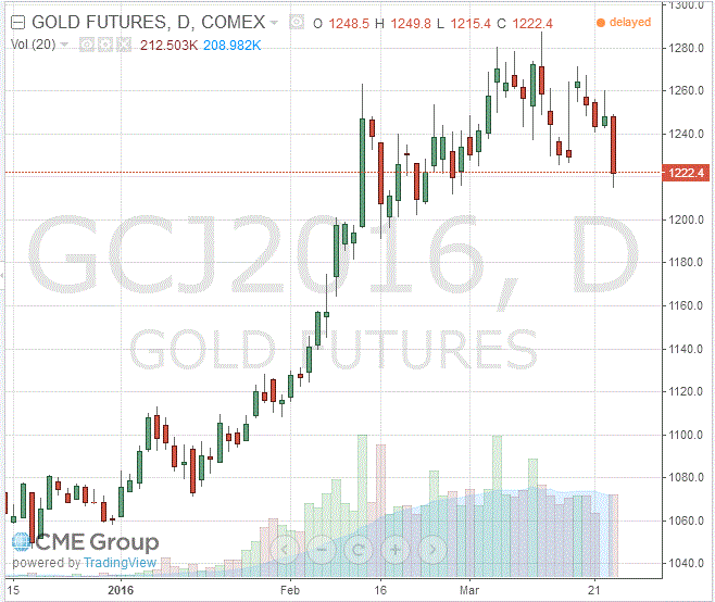 Стоимость апрельского фьючерса на золото на COMEX сегодня упала до $1222,40 за унцию.