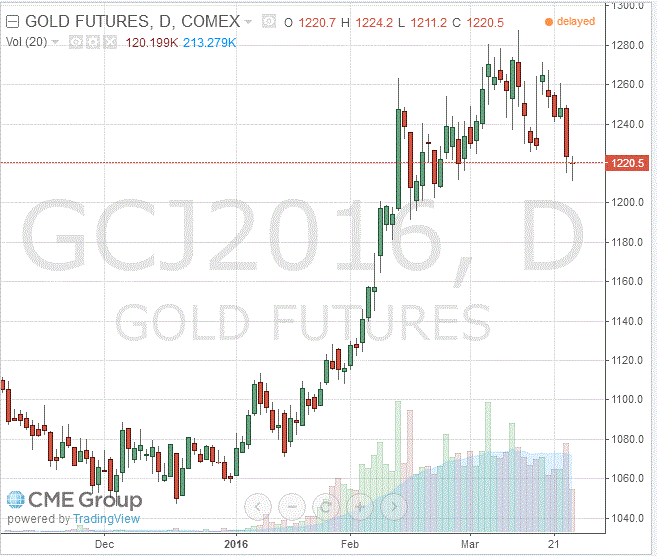Стоимость апрельского фьючерса на золото на COMEX сегодня упала до $1220,50 за унцию.
