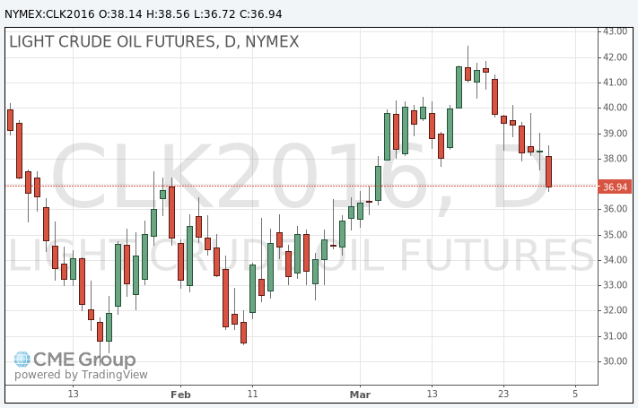 Стоимость майских фьючерсов на американскую легкую нефть марки WTI (Light Sweet Crude Oil) упала до 36,72 доллара за баррель.
