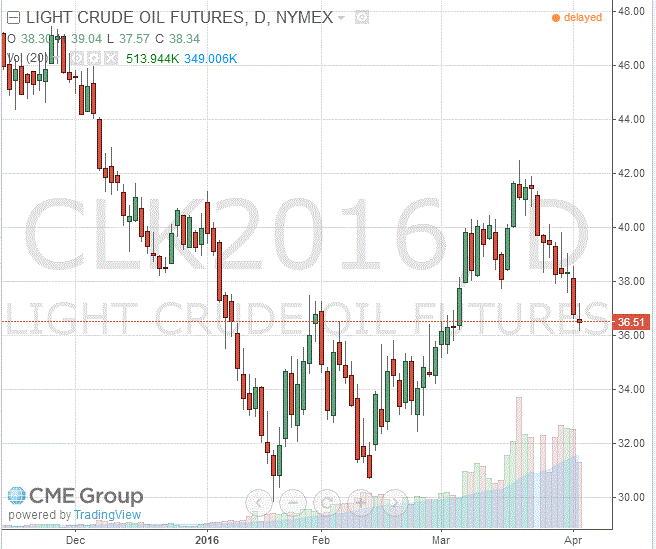 Стоимость майских фьючерсов на американскую легкую нефть марки WTI (Light Sweet Crude Oil) упала до 36,51 доллара за баррель.
