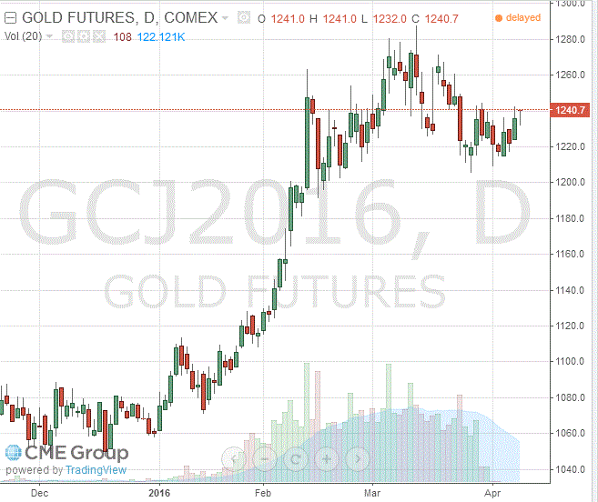 Стоимость апрельского фьючерса на золото на COMEX сегодня выросла до $1240,7 за унцию.