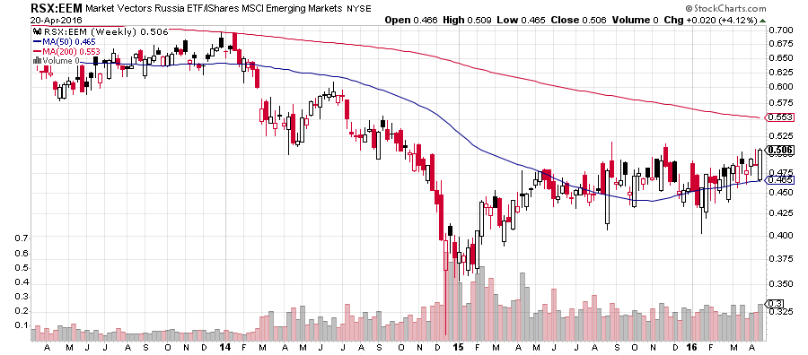 Таким образом, видим, что российский рынок акций, безусловно, более волатилен по отношению к MSCI EEM, и тем более по отношению к американскому рынку, однако при оптимистичных настроениях на рынках чувствует себя гораздо!!! лучше конкурентов. Относительная динамика российского рынка акций против индекса развивающихся рынков постепенно начинает выправляться (несколько последних лет российский рынок демонстрировал негативную динамику по отношению в целом к группе развивающихся рынков, сейчас же ситуация, возможно, начинает меняться).