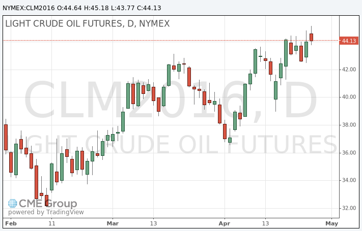 Стоимость июньских фьючерсов на американскую легкую нефть марки WTI (Light Sweet Crude Oil) выросла до 45,18 доллара за баррель и затем упала до 43,77 доллара за баррель.