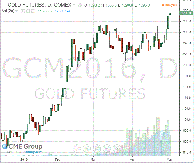 Стоимость июньского фьючерса на золото на COMEX сейчас составляет $1296,0 за унцию.