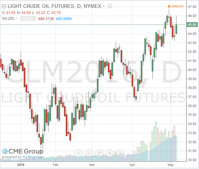 Стоимость июньских фьючерсов на американскую легкую нефть марки WTI (Light Sweet Crude Oil) выросла до 45,05 доллара за баррель.