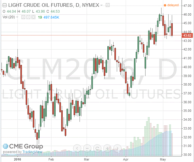 Стоимость июньских фьючерсов на американскую легкую нефть марки WTI (Light Sweet Crude Oil) упала до 43,62 доллара за баррель.
