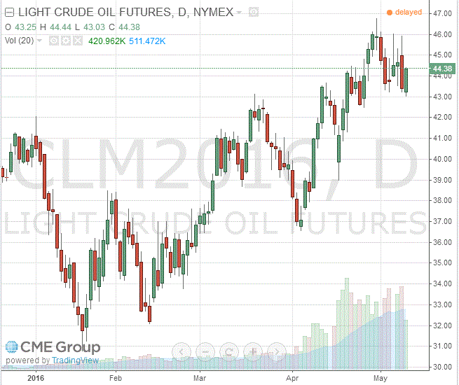 Стоимость июньских фьючерсов на американскую легкую нефть марки WTI (Light Sweet Crude Oil) выросла до 44,38 доллара за баррель.