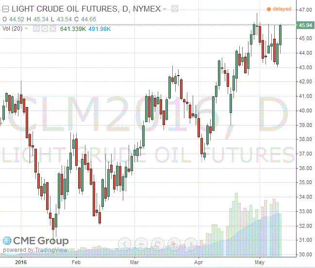 Стоимость июньских фьючерсов на американскую легкую нефть марки WTI (Light Sweet Crude Oil) выросла до 45,94 доллара за баррель.