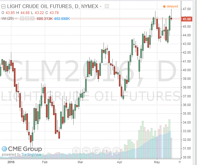 Стоимость июньских фьючерсов на американскую легкую нефть марки WTI (Light Sweet Crude Oil) упала до 45,88 доллара за баррель.