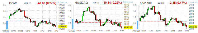 Основные фондовые индексы США незначительно снизились в среду, несмотря на позитивное начало торгов. Участники рынка продолжали оценивать вероятность сохранения членства Британии в ЕС по итогам референдума, который пройдет завтра. Накануне всенародного голосования большинство опросов общественного мнения указывают на то, что большинство респондентов поддерживают вариант "остаться".