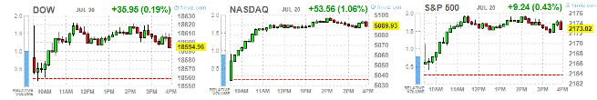 Росту индексов также способствовала позитивная динамика цен на нефть после того, как данные показали, что еженедельные запасы сырой нефти упали. Минэнерго США сообщило, что запасы нефти сократились больше, чем ожидалось, однако запасы бензина неожиданно выросли. Согласно отчету, на неделе 9-15 июля запасы нефти упали на 2,3 млн баррелей до 519,4 млн баррелей, оставаясь на высоких по историческим меркам уровнях для данного периода года. Аналитики прогнозировали снижение на 2,1 млн. баррелей. Запасы нефти в терминале Кушинга выросли на189 000 баррелей до 64,1 млн баррелей.