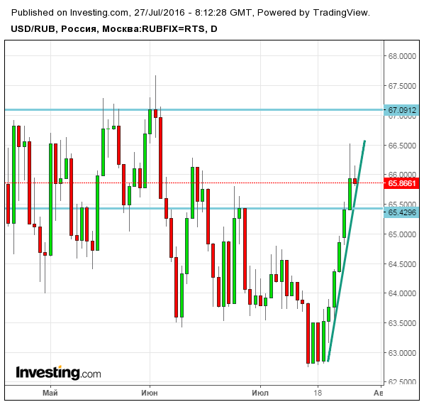 Отслеживают динамику нефти и движения российской валюты. Для неё фактор нефти остаётся основным. Поэтому при прогнозируемом её снижении рубль подвержен ослаблению. Сейчас пара доллар/рубль тестирует снизу вверх уровень 66-66,5, который долго был нижней границей диапазона и мощнейшей поддержкой, а теперь стал сильным верхним сопротивлением. Пока нефть на уровне $44,7-45, для рубля актуален диапазон 65-66,5 руб/дол. То есть коррекция пары доллар/рубль вниз вполне возможна на фиксации прибыли. При предполагаемом уходе Brentк $44 и ниже, наша пара может подняться к 67 руб/дол. и выше.