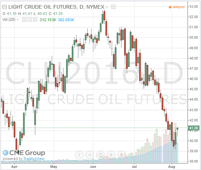 Стоимость сентябрьских фьючерсов на американскую легкую нефть марки WTI (Light Sweet Crude Oil) выросла до 41,26 доллара за баррель.