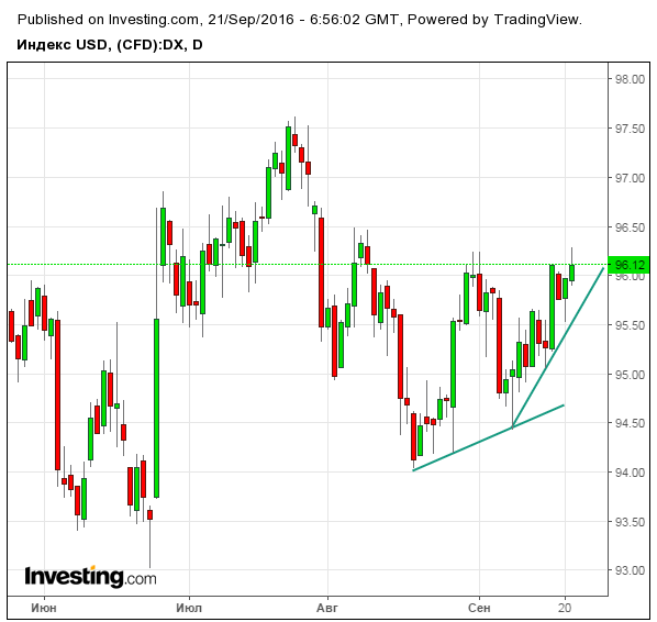 Американская валюта на фоне этого осторожного оптимизма скакнула вверх, тестируя важное текущее сопротивление - 96,2 п. по индексу доллара DX, верхнюю границу диапазона в 95-96,2 пунктов. Её пробой и закрепление выше будет означать движение дальше вверх, к уровням 96,5 -97 п. , при благоприятных посылах со стороны Федрезерва.