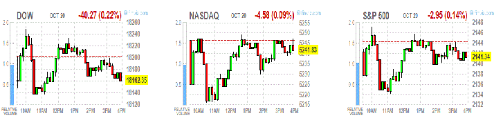Основные фондовые индексы США незначительно упали в четверг на фоне слабых квартальных отчетов больших компаний. В частности, телекоммуникационный гигант Verizon (VZ) умерил оптимизм по поводу сезона отчетностей, потеряв примерно 2,5% из-за снижения квартальной выручки, в то время как конкурирующая AT&T (T) упала на 1,9%. Падение цен на нефть оказало давление на акции энергетических компаний.