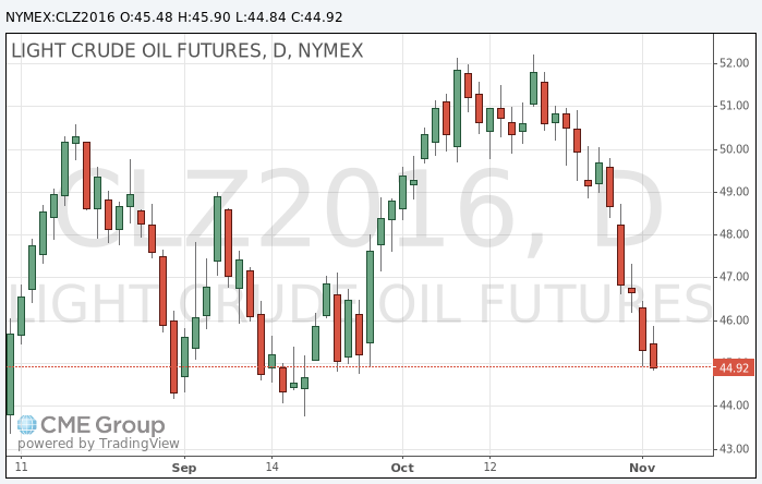 Стоимость декабрьских фьючерсов на американскую легкую нефть марки WTI (Light Sweet Crude Oil) упала до 44,72 доллара за баррель на Нью-йоркской товарно-сырьевой бирже.