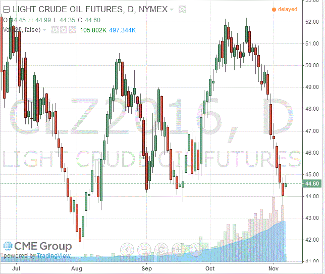 Стоимость декабрьских фьючерсов на американскую легкую нефть марки WTI (Light Sweet Crude Oil) выросла до 44,60 доллара за баррель на Нью-йоркской товарно-сырьевой бирже.