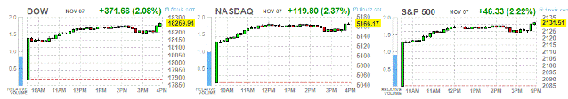 Основные фондовые индексы США сильно выросли в понедельник, за день до президентских выборов в США, так как перспективы демократа Хиллари Клинтон выросли после того, как ФБР заявило, что не будет настаивать на открытии уголовного дела, связанного с использованием ее частной электронной почты.
