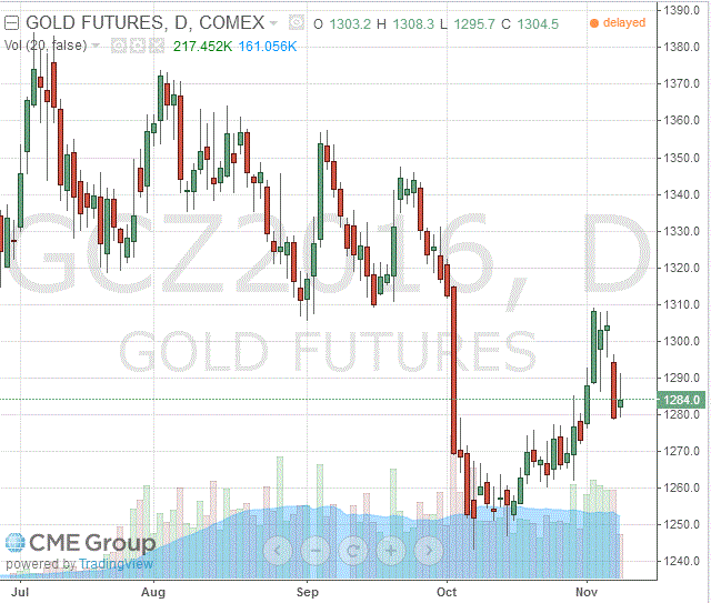 Стоимость декабрьского фьючерса на золото на COMEX выросла до $1284,0 за унцию.