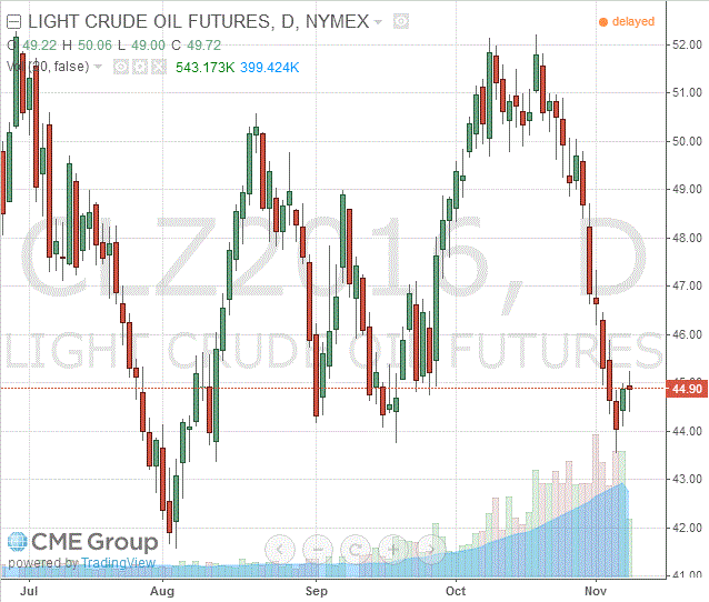 Стоимость декабрьских фьючерсов на американскую легкую нефть марки WTI (Light Sweet Crude Oil) выросла до 44,90 доллара за баррель на Нью-йоркской товарно-сырьевой бирже.