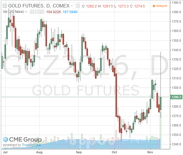 Первоначально золото подорожало почти на 5 процентов, достигнув шестинедельного максимума на уровне $1,337.40 за унцию, после того, как стало известно, что кандидат от республиканцев Трамп одержал победу над демократом Хиллари Клинтон на президентских выборах. Такие новости оказались сюрпризом для рынков, и побудило многих инвесторов искать убежища в безопасных активах, таких как золото, иена и швейцарский франк. Однако, позже золото утратило почти все заработанные позиции, так как американский доллар возобновил свое повышение.