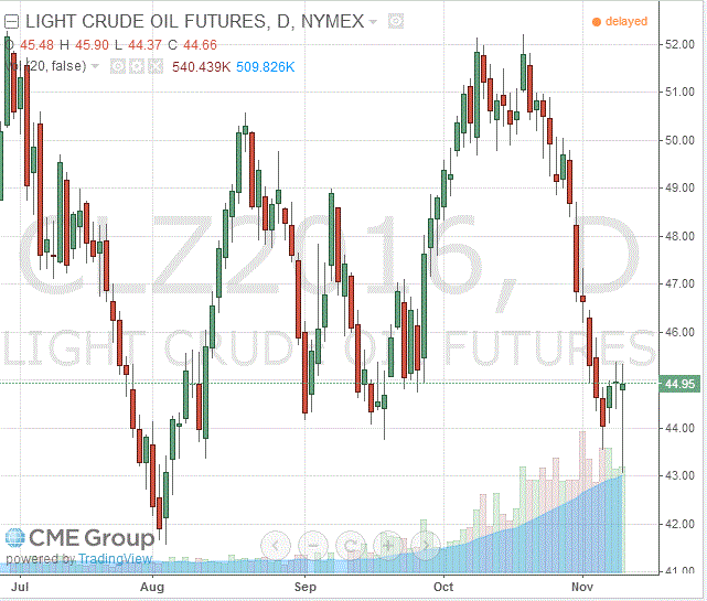 Стоимость декабрьских фьючерсов на американскую легкую нефть марки WTI (Light Sweet Crude Oil) выросла до 44,95 доллара за баррель на Нью-йоркской товарно-сырьевой бирже.
