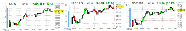 Основные фондовые индексы США заметно выросли в среду, нивелировав большие овернайт потери, питаемые выборами в США. Позитив на рынки внес рост секторов, которые готовы извлечь выгоду из президентства Трампа.