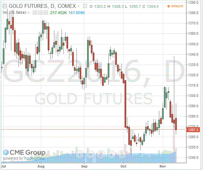Стоимость декабрьского фьючерса на золото на COMEX упала до $1267,2 за унцию.