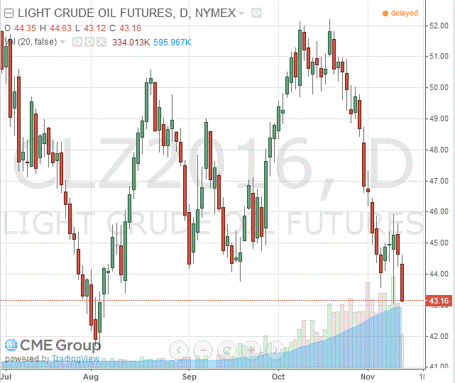 Стоимость декабрьских фьючерсов на американскую легкую нефть марки WTI (Light Sweet Crude Oil) снизилась до 43,16 доллара за баррель на Нью-йоркской товарно-сырьевой бирже.