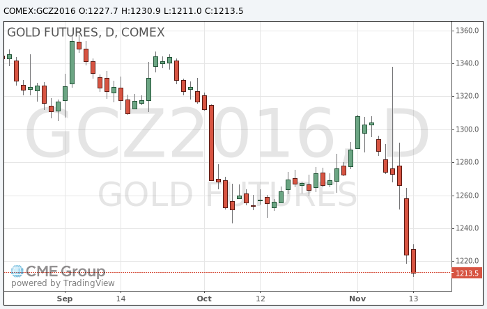 Стоимость декабрьского фьючерса на золото на COMEX упала до $1211,0 за унцию.