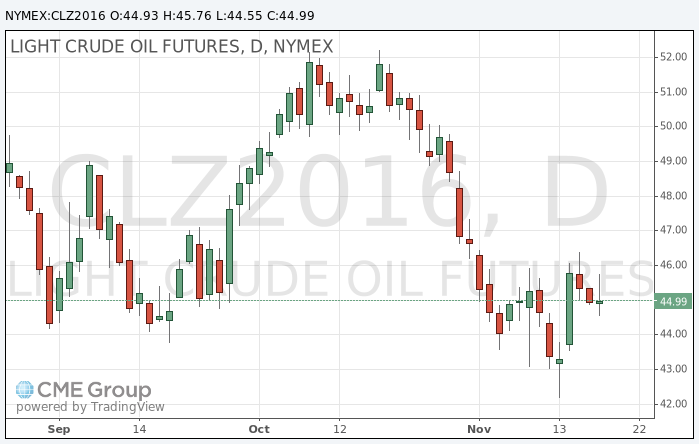 Стоимость декабрьских фьючерсов на американскую легкую нефть марки WTI (Light Sweet Crude Oil) выросла до 45,76 доллара за баррель на Нью-йоркской товарно-сырьевой бирже.