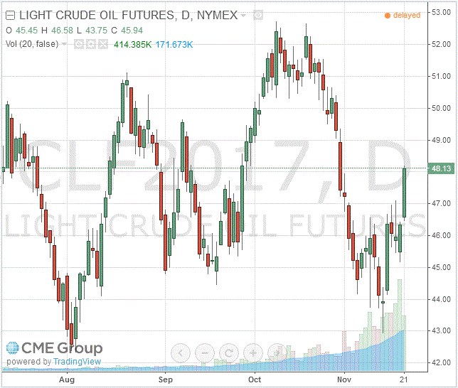 Стоимость январских фьючерсов на американскую легкую нефть марки WTI (Light Sweet Crude Oil) выросла до 48,13 доллара за баррель на Нью-йоркской товарно-сырьевой бирже.