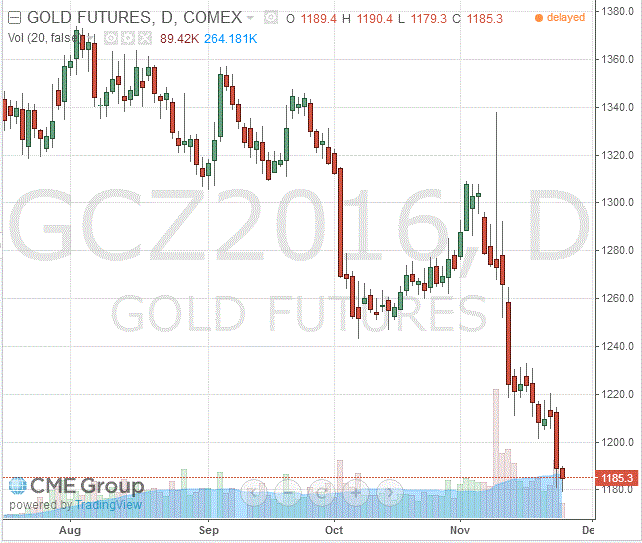 Стоимость декабрьского фьючерса на золото на COMEX снизилась до $1185,30 за унцию.
