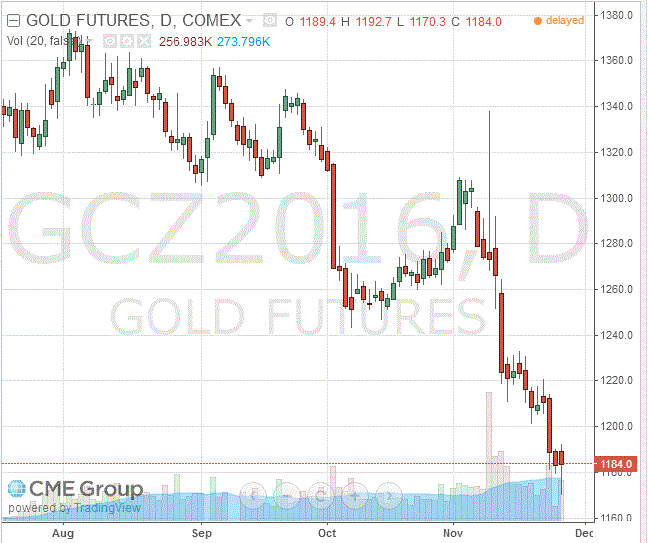 Стоимость декабрьского фьючерса на золото на COMEX восстановилась до $1184,00 за унцию.