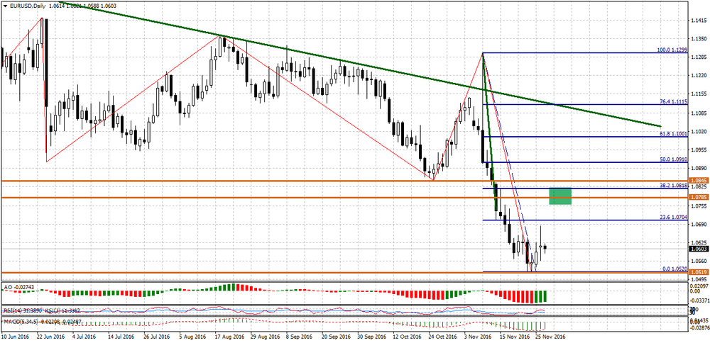 С другой стороны, есть опасения давления на евро/доллар не только от ФРС, но и от самой еврозоны. По прогнозам, темп роста экономики останется на уровне 0,3% в 3 и 4 квартале , индекс потребительских цен вырастет не более 0,2% в 2016 г. и 1.3% в 2017 г., что существенно ниже цели ЕЦБ в 2%. Поэтому вполне вероятно, что по итогам декабрьской встречи европейский центробанк увеличит сумму выкупа активов и продлит эту программу и после 1 квартала 2017 года, что уже сейчас ослабляет евро. Дополнительную политическую неопределённость доставляют референдум в Италии, выборы во Франции, условия выхода Великобритании из Евросоюза.