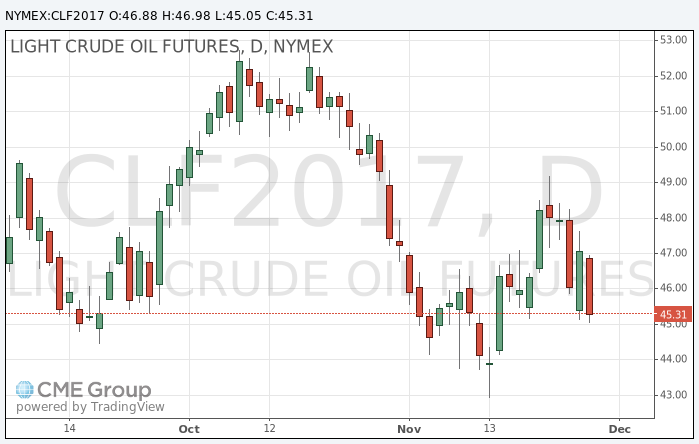 Стоимость январских фьючерсов на американскую легкую нефть марки WTI (Light Sweet Crude Oil) упала до 45,05 доллара за баррель на Нью-йоркской товарно-сырьевой бирже.