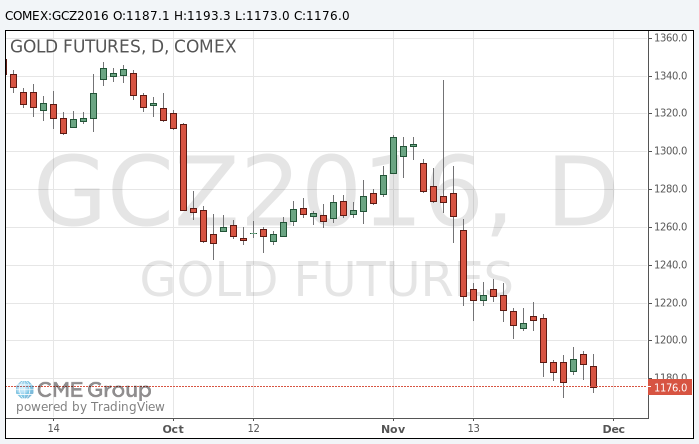 Стоимость декабрьского фьючерса на золото на COMEX упала до $1172,0 за унцию.