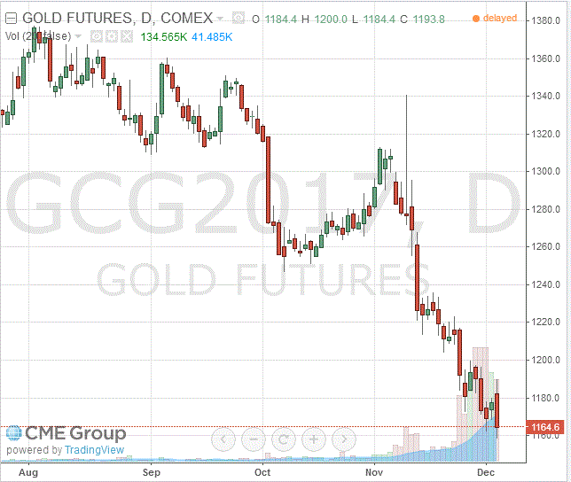 Аналитики считают, что Федеральная резервная система повысит процентные ставки на своем ближайшем заседании, которое состоится 13-14 декабря. Согласно рынку фьючерсов, сейчас вероятность ужесточения денежно-кредитной политики ФРС на декабрьском заседании составляет 97,2% по сравнению с 92,7% днем ранее. Напомним, золото обычно дешевеет при росте процентных ставок, поскольку оно не приносит процентного дохода и становится в этом случае менее востребованным по сравнению с активами, такой доход приносящими.