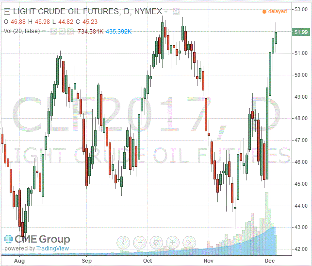 Стоимость январских фьючерсов на американскую легкую нефть марки WTI (Light Sweet Crude Oil) выросла до 51,99 доллара за баррель на Нью-йоркской товарно-сырьевой бирже.