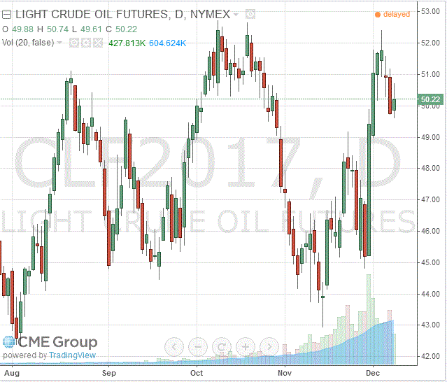 Стоимость январских фьючерсов на американскую легкую нефть марки WTI (Light Sweet Crude Oil) выросла до 50,22 доллара за баррель на Нью-йоркской товарно-сырьевой бирже.
