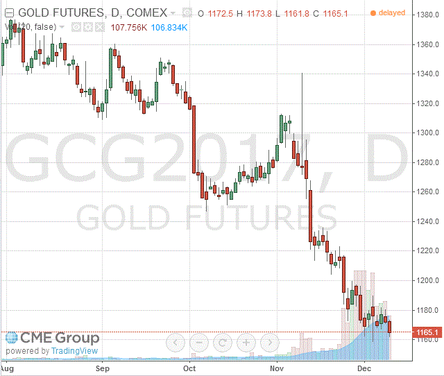 Стоимость февральского фьючерса на золото на COMEX снизилась до $1165,1 за унцию.