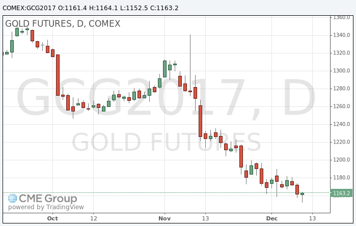 В ходе сегодняшних торгов золото отступило от достигнутого в начале дня минимума за 10 месяцев в ожидании повышения базовой процентной ставки Федеральной резервной системы США на декабрьском заседании.