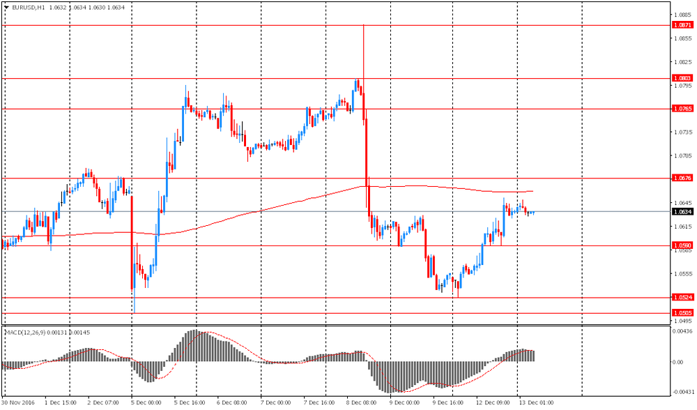 В начале сессии вторника ситуация на финансовых рынках мира является достаточно смешанной. Вышедшие австралийские и китайские данные существенного влияния на рынки не оказали. Австралийская статистика была смешанной, а вот китайские данные превзошли ожидания. Но сейчас в центре внимания участников рынков находится начинающиеся сегодня заседание FOMC. Его итоги будут озвучены завтра. Это будет последнее в текущем году заседание американского центробанка и оно будет расширенным, то есть будет сопровождаться публикацией обновленных макроэкономических прогнозов и пресс-конференцией главы регулятора. На текущий момент ужесточение денежно-кредитной политики ФРС на декабрьском заседании практически полностью учтено в ценах. Поэтому наиболее важным в декабрьском заседании будет не само повышение ставки, а прогнозы федрезерва относительно дальнейших планов, а также комментарии Джанет Йеллен на этот счет.