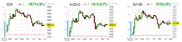 Основные фондовые индексы Уолл-стрит выросли в четверг, чему способствовал рост акций компаний финансового сектора на следующий день после того, как Федеральная резервная система повысила процентные ставки впервые в этом году и сигнализировала о более быстром темпе следующих повышений в 2017 году.