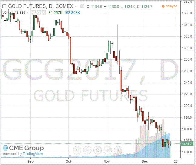 Золото значительно пострадало от масштабного ралли доллара после президентских выборов в США в ноябре и более воинственного тона Федеральной резервной система в ходе декабрьского заседания. Напомним, ФРС США приняла решение повысить процентные ставки, и при этом сигнализировала о еще трех увеличениях ставки в следующем году. Золото обычно дешевеет при росте процентных ставок, поскольку оно не приносит процентного дохода и становится в этом случае менее востребованным по сравнению с активами, такой доход приносящими. В целом, цены на золото упали более чем на 11 процентов после выборов, прежде чем нашли сильную поддержку на отметке $1125 за унцию.